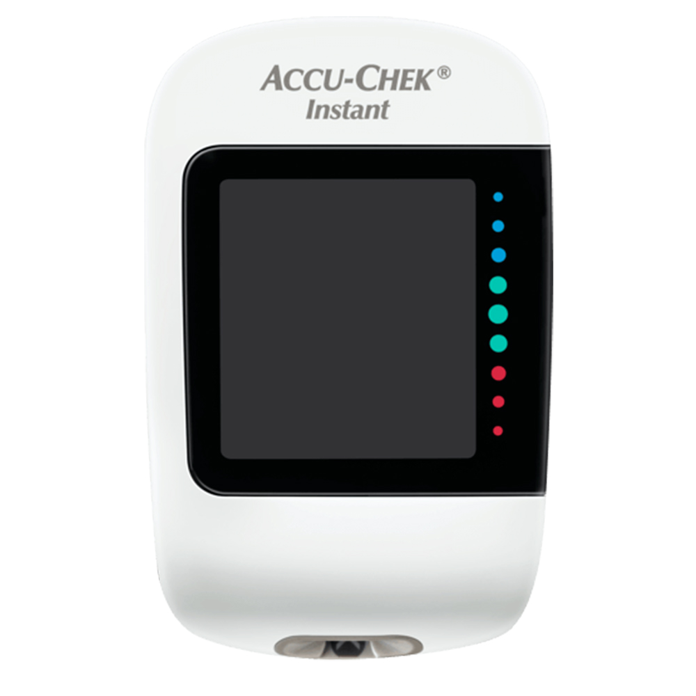 GLUCÓMETRO ACCU-CHECK® INSTANT ES UN MEDIDOR DE GLUCOSA QUE NO NECESITA CONFIGURACIÓN SOLO SE NECESITA DE UN SOLO BOTÓN, TIENE UN INDICADOR QUE MIDE EL RANGO POR COLOR Y SU SINCRONIZACIÓN ES AUTOMÁTICA JUNTO CON LA APP DE MYSUGR.